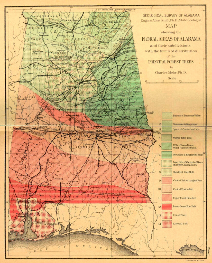 These all find in Alabama their southern limit on this line. Although the vegetation of the Carolinian area presents in its broad features great uniformity, particularly in its tree growth, there exist in its range of nine degrees of latitude differences in the latitudinal distribution of heat, which necessarily affect the distribution of plants within its limits and present insurmountable obstacles to the extension of a number of species northward. Due to this temperature element, there is a most pronounced limit beyond which the successful cultivation of the cotton crop can not be pushed, and which also presents a barrier to several trees and a number of other plants of Southern distribution that are only rarely met farther north, as for example, the willow oak (Quercus phellos), loblolly pine (Pinus taeda), longleaf pine (Pinus palustris) and cane (Arundinaria macrosperma [gigantea]). This line, roughly extending from the Atlantic Coast at the mouth of the Chesapeake Bay westward to southwestern Missouri and northern Arkansas, was located by Gray along latitude 30 deg 36′, and by him was regarded as the line of separation between the two principal floral divisions of eastern North America, namely, the flora of the northern United States and Canada and the flora of the Southern States. In Alabama it is only this lower belt of the Carolinian area, embracing the mountain region and the lower hills with which we are concerned.”